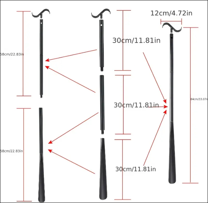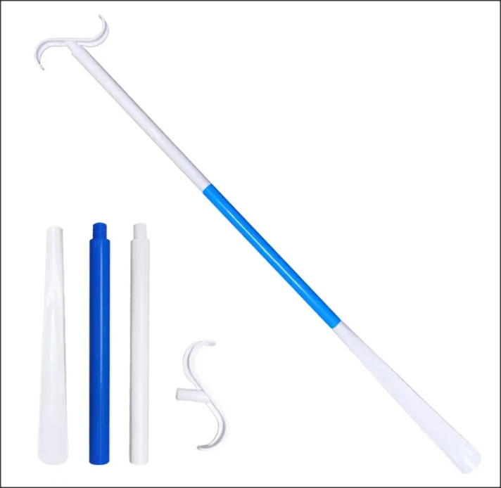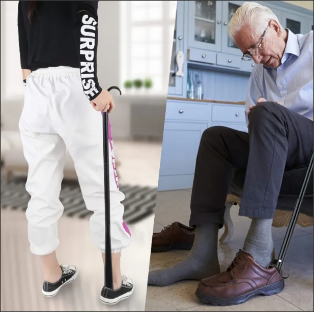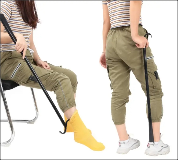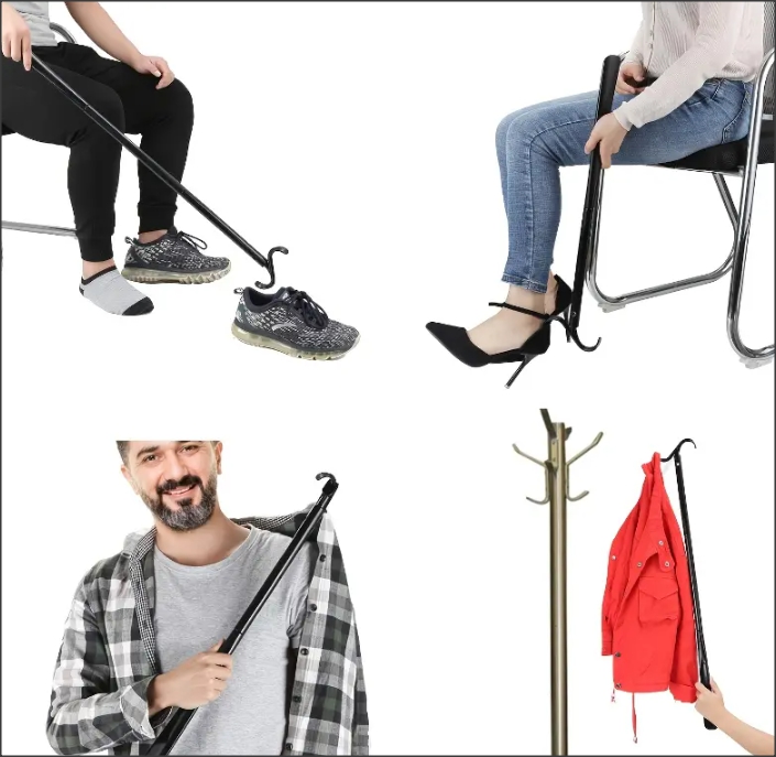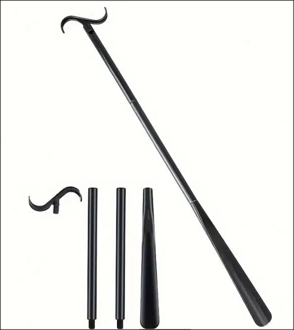 Das gegenüberliegende Ende verfügt über Anziehhaken, die Ihnen das Anziehen von Socken, Schuhen, Hosen und Oberteilen erleichtern, ohne sich anzustrengen.